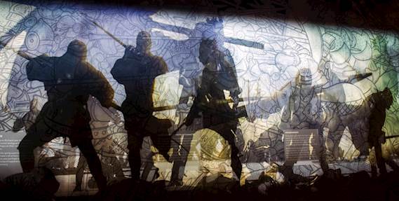 Visitors are then immersed into the heart of the historical battle with two films projected at 4K resolution onto 6-metre wide etched metal fretwork screens in the gallery space. The brutality of the battle, the sheer force of the armies and the crushing atmosphere of battle can be felt in the space. The projections make the action literally ‘jump’ from the first screen to the second, with horses’ hooves flying over the audience to The Last Charge, which depicts Richard’s final moments.