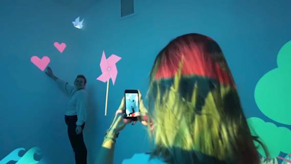 For the interactivity, the team used the Interactive Wall Kit and conductive paint from Bare Conductive. Visitors can select between 12 different selfie-backgrounds by touching the hand-painted icons on the wall.