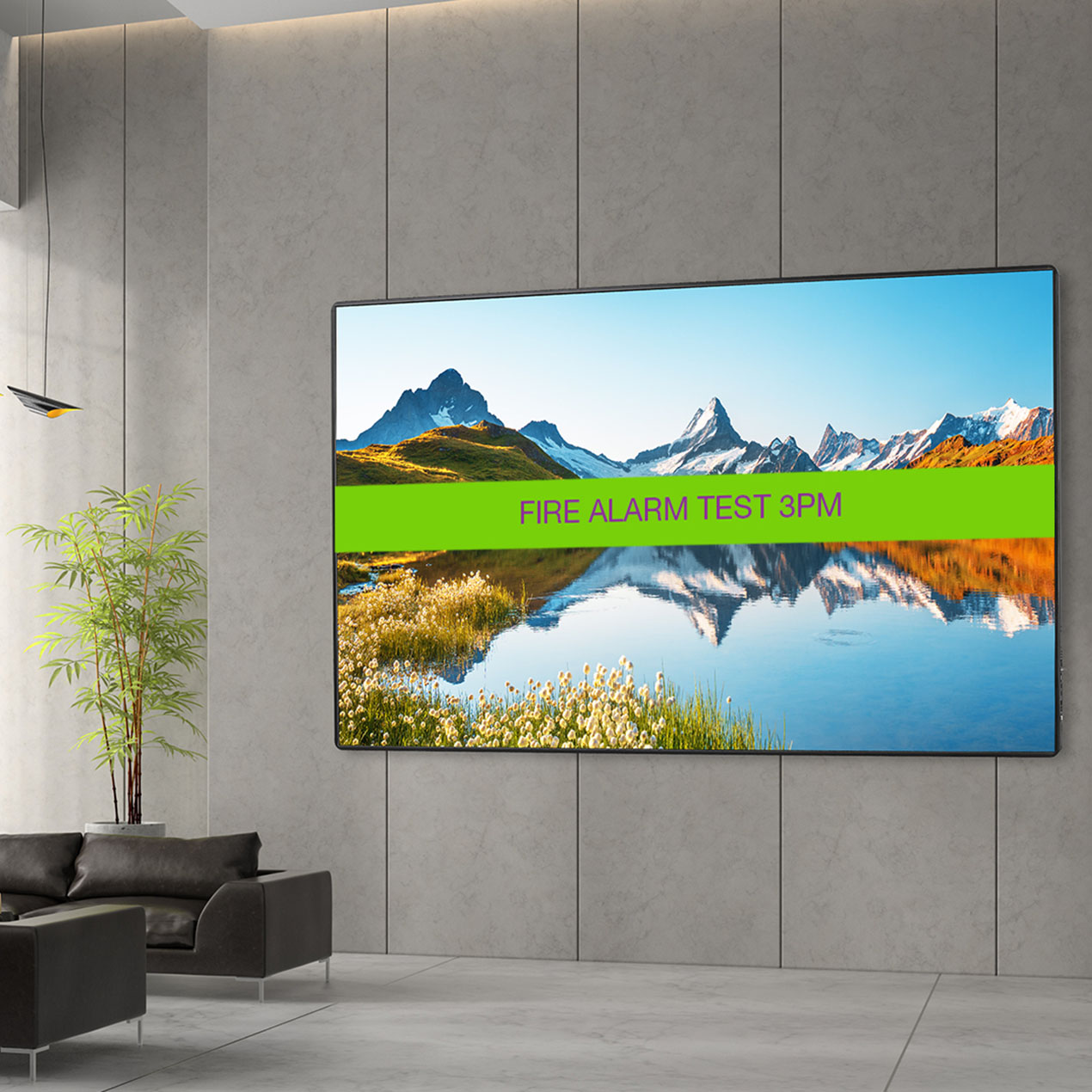 Celebrate success or announce new services by broadcasting videos, or share photos across any display company wide. Send emergency messages and alerts for safety and security.